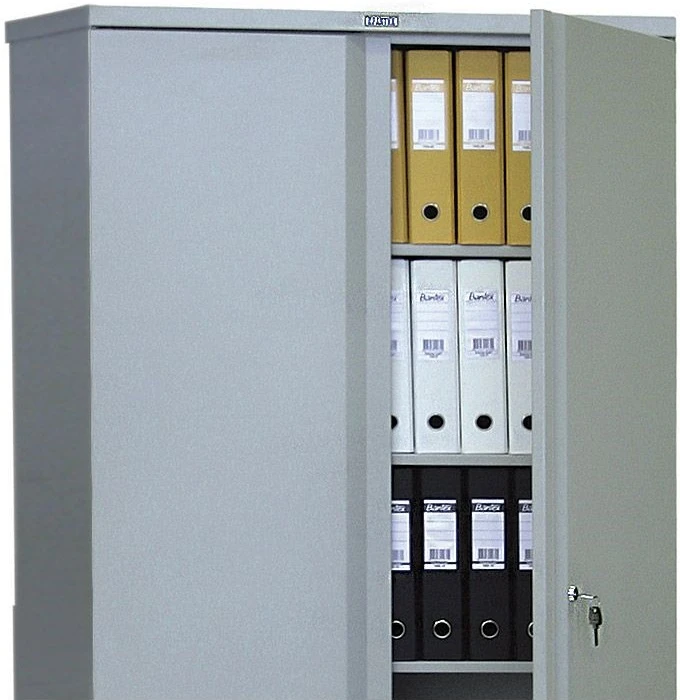 Двухстворчатый металлический шкаф с распашными дверьми, предназначенный для хранения крупных бумажных архивов, финансово-бухгалтерской отчётности и прочей документации в медицинских учреждениях любой направленности.